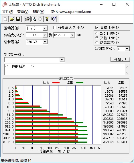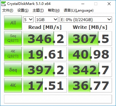 在USB3.0接口下的速度實測,讀寫速度為為409 MB/s 、348MB/s