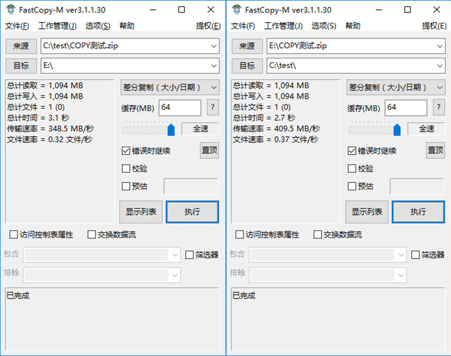 測試小結:以上的一系列測試我們可以看出閃迪至尊極速500型移動固態硬盤的持續性讀寫速度達到422 MB/s和367 MB/s(已超過官方最高理論速度,并相當的穩定),著實讓小編一陣驚喜。在此,小編還特地用FastCopy做了一個小實驗,小編使用閃迪500型分別在USB3.0接口與USB2.0上進行讀寫速度實測,而測試的結果相差了十倍以上,可見閃迪500型只有USB3.0下才能發揮其極致的作用。所以在這里要提醒一下大家,如果,你的電腦上同時用著USB3.0以及USB2.0的接口時,千萬不要插錯接口,不然就享受不到這極致的速度了。而在其他方面,4K隨機讀寫13MB/s和36MB/s、64線程4K讀寫為17MB/s和40MB/s,也是高于一般機械硬盤的,表現確實近乎人意。