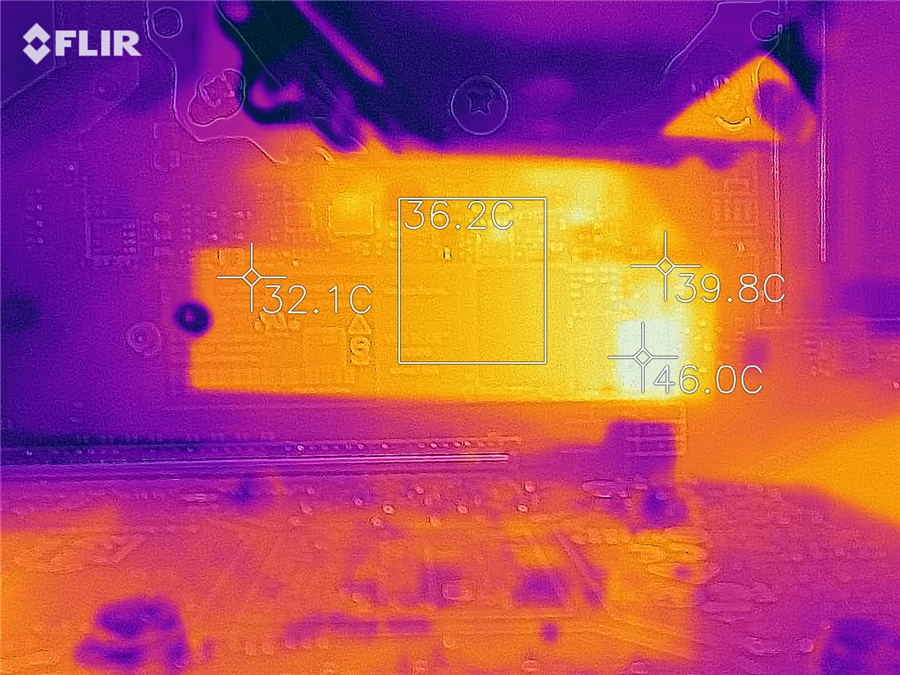 在待機狀態下,通過熱成像儀可以觀察到SN500的最高溫度為46攝氏度。