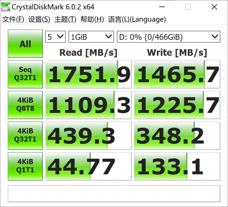 在CrystalDiskMark中,我們測得SN750的順序讀寫速度分別為1751.9 MB/s和1465.7 MB/s,4K讀寫性能達到了44.77 MB/s和133.1 MB/s,遠超一般SATA SSD的水準能夠讓其在日常使用中有著更快的響應速度。