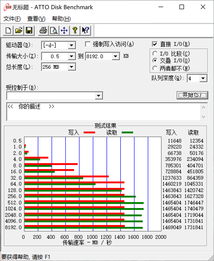 ATTO Disk Benchmark能夠極大程度地壓榨出硬盤的極限性能,在這項測試中SN500的最高讀寫速度達到了1731.84 MB/s和1469.05 MB/s。