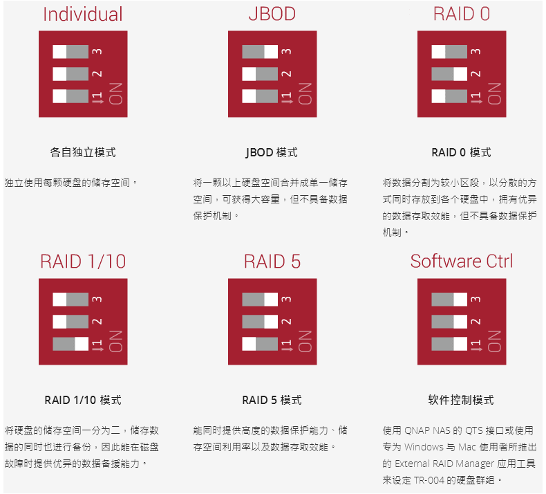 威聯(lián)通TR-004支持多種磁盤(pán)與數(shù)組配置,可以按照需求彈性規(guī)劃存儲(chǔ)空間。將模式切換開(kāi)關(guān)的按鍵拔至相應(yīng)位置,即可建立各自獨(dú)立模式、JBOD模式、RAID 0、RAID 1/10或RAID 5群組。除此之外,還可以啟用軟件控制功能,通過(guò)使用威聯(lián)通專(zhuān)門(mén)為Windows與Mac使用者所推出的應(yīng)用工具來(lái)設(shè)定TR-004的硬盤(pán)群組。