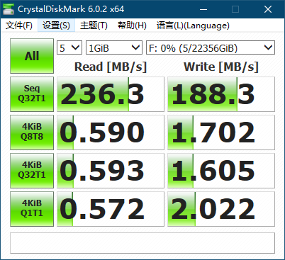 可以看到經(jīng)過(guò)CrystalDiskMark測(cè)試其讀寫(xiě)速度,我們默認(rèn)隨機(jī)模式下讀取與寫(xiě)入速度分別是236.3MB/s與188.3MB/s。