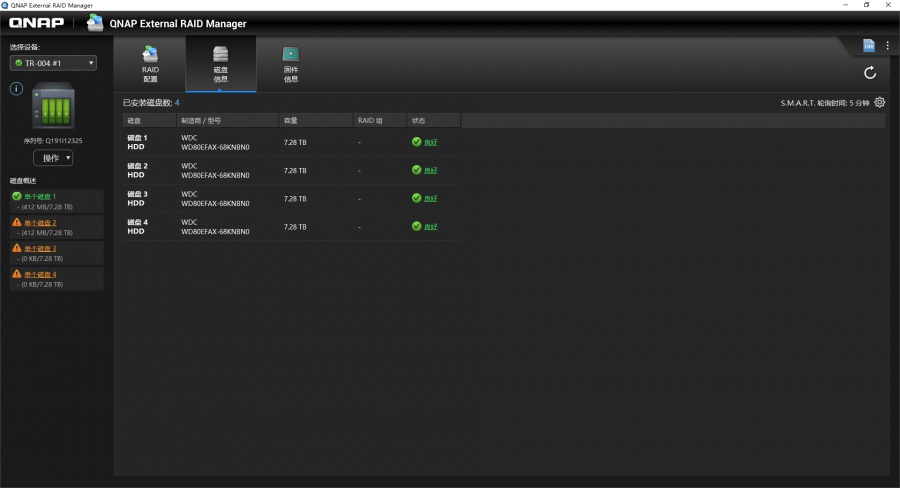 QNAP External RAID Manager除了可以構(gòu)建RAID外,還可以查詢磁盤(pán)信息和固件信息。
