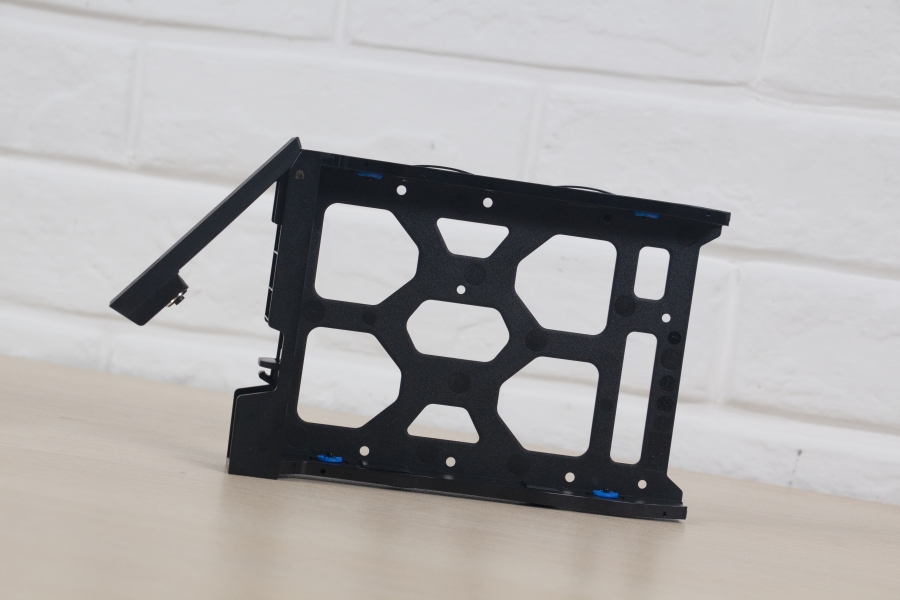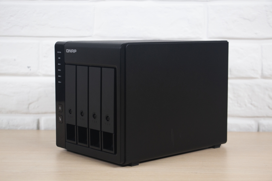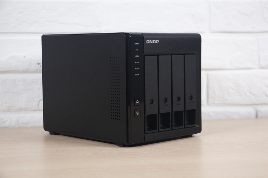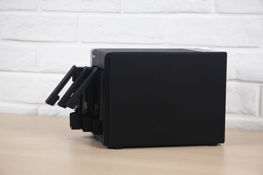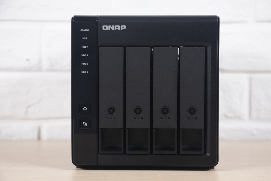 在外觀上威聯(lián)通TR-004依舊采用了傳統(tǒng)的家族式設(shè)計(jì),黑色機(jī)身、線條分明,熟悉的臥式機(jī)身設(shè)計(jì),整體外觀呈極簡(jiǎn)大氣風(fēng)格。在產(chǎn)品正面偏右位置依次排列四個(gè)硬盤(pán)托架,且四個(gè)托架均為可鎖式,可以有效防止插拔硬盤(pán)帶來(lái)的數(shù)據(jù)損壞。同時(shí),四個(gè)硬盤(pán)托架也均為免螺絲安裝結(jié)構(gòu),在安裝硬盤(pán)時(shí),只需拆開(kāi)側(cè)邊條,裝入之后再合上側(cè)邊條即可,可以安裝3.5英寸的機(jī)械硬盤(pán)以及2.5英寸的機(jī)械或固態(tài)硬盤(pán)。