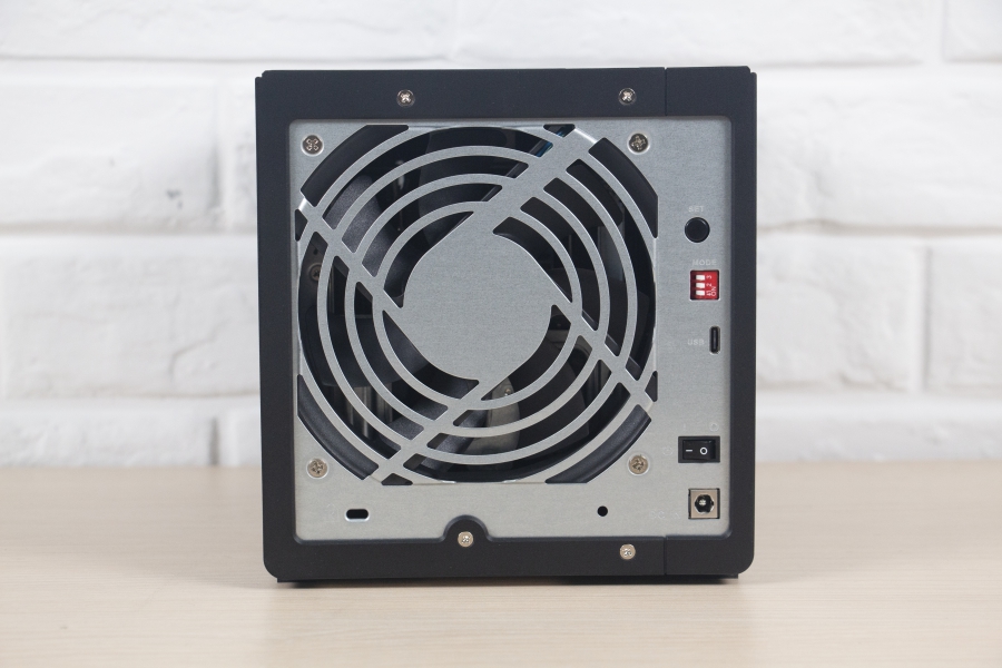 TR-004背部擁有一個(gè)12厘米的散熱風(fēng)扇進(jìn)風(fēng)口,形成風(fēng)冷散熱,可根據(jù)硬盤(pán)與系統(tǒng)溫度進(jìn)行五級(jí)變速。風(fēng)扇右側(cè)設(shè)計(jì)有電源開(kāi)關(guān)鍵、硬盤(pán)模式確認(rèn)鍵、RAID模式切換鍵、USB 3.0 Type-C接口以及一個(gè)電源接口。