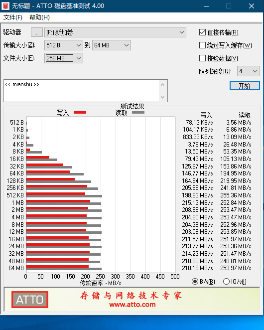 通過(guò)ATTO Disk Benchmark測(cè)出其最高讀取速度為255.36MB/s,最高寫(xiě)入速度為215.13MB/s。