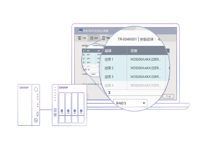 除此之外,還可以將TR-004作為NAS的外接存儲(chǔ)設(shè)備來(lái)使用,與此同時(shí)TR-004就相當(dāng)于一個(gè)外置硬盤(pán)。在PC端External RAID Manager軟件中構(gòu)建好RAID群組之后,就可以將TR-004直接連接到NAS上復(fù)制 ,然后再拷貝到其它平臺(tái)。