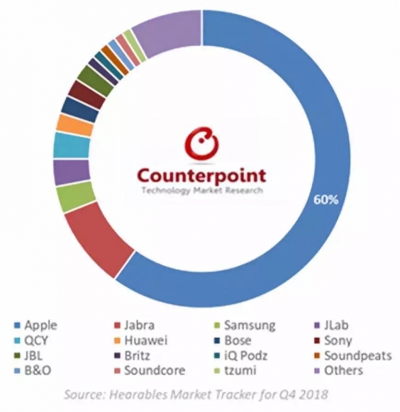 近日,市場(chǎng)調(diào)研機(jī)構(gòu)Counterpoint Research公布了一份《2018年第四季度無(wú)線耳機(jī)市場(chǎng)份額》的相關(guān)數(shù)據(jù)。數(shù)據(jù)顯示,AirPods在2018年的全年銷(xiāo)量為3500萬(wàn)部,占據(jù)了無(wú)線耳機(jī)全部銷(xiāo)量的60%,擊敗了Jabra和Bose的等知名品牌。據(jù)AppleInsider報(bào)道,AirPods也是美國(guó)最受歡迎的無(wú)線耳機(jī)品牌,值得一提的是,蘋(píng)果旗下的Bose市場(chǎng)表現(xiàn)也非常不錯(cuò)。
