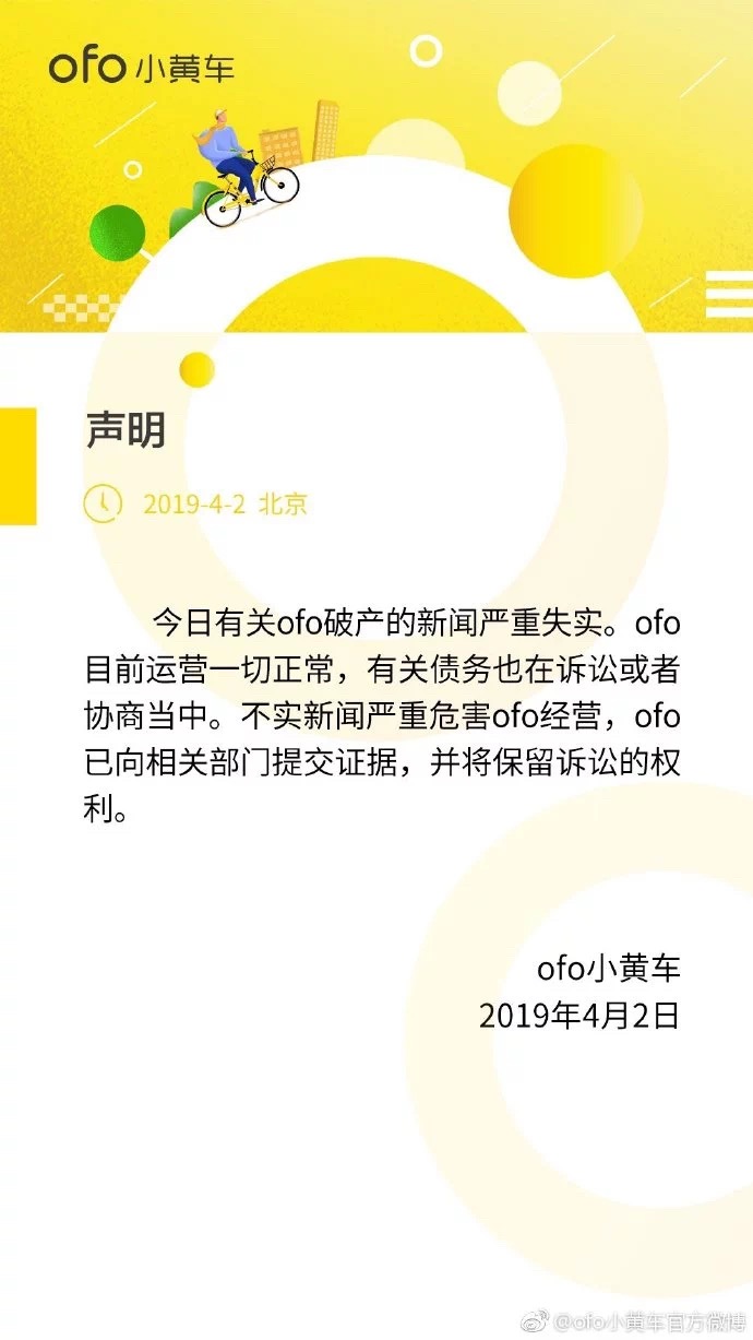 4月2日,各大媒體都傳出了ofo現身全國破產網的消息。對此,ofo發布聲明稱,有關ofo破產的新聞嚴重失實,目前運營一切正常,有關債務也在訴訟或者協商中。不實新聞嚴重危害了ofo經營,ofo已向相關部門提交證據,并將保留訴訟的權利。