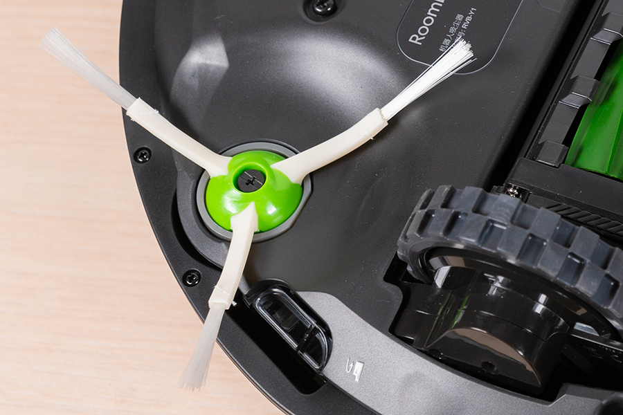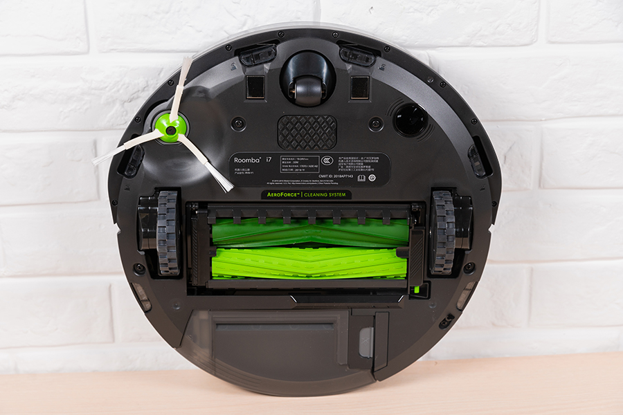 iRobot i7+機身的底部和上一代的9系列相比有進一步的升級,搭載了進階版三重高效清潔系統,尤其在膠刷的升級最為明顯,此前9系列的雙膠組合是棕色和黑色,而iRobot i7+則將它們都替換成了環保的綠色。
