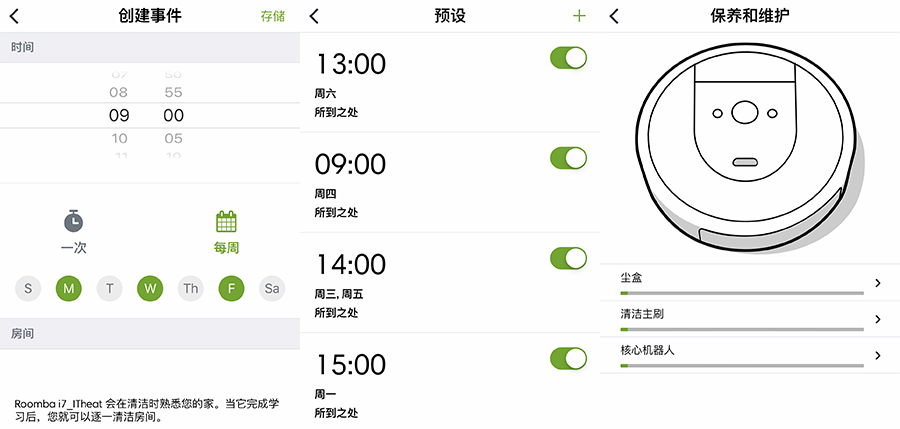 像自定義清潔偏好和和清掃預設這類功能都是十分實用的功能,用戶能隨時隨地預約家中單一或多個房間進行清潔任務,也能預設每個星期的周幾的幾點開始做周期性的清掃。并且在APP中你能夠隨時了解塵盒、清潔主刷以及核心機器人的當下情況,以便于更好維護和保養。