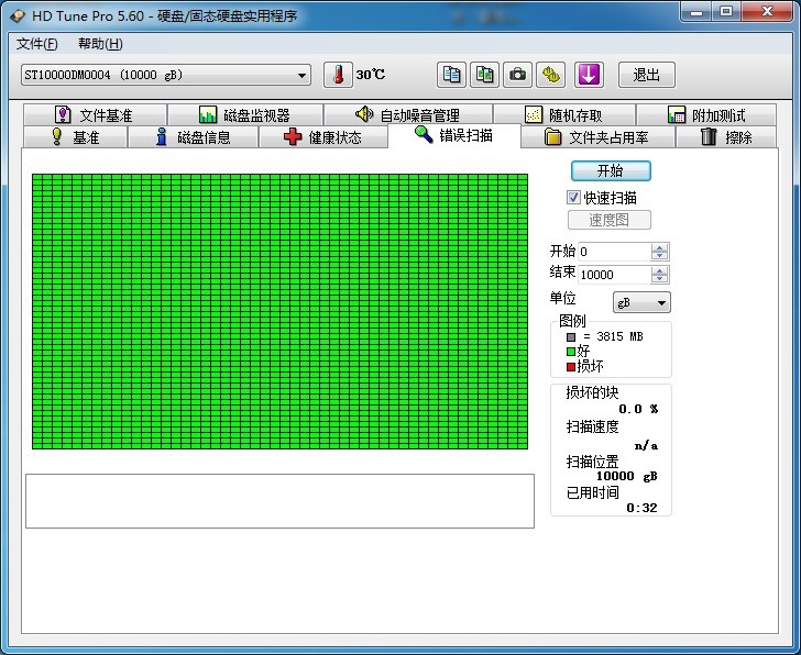 雖然新的外觀確實(shí)很好看,但是速度才是評(píng)判一塊硬盤好壞的第一標(biāo)準(zhǔn)。首先用HD Tune Pro檢測(cè)下壞道。