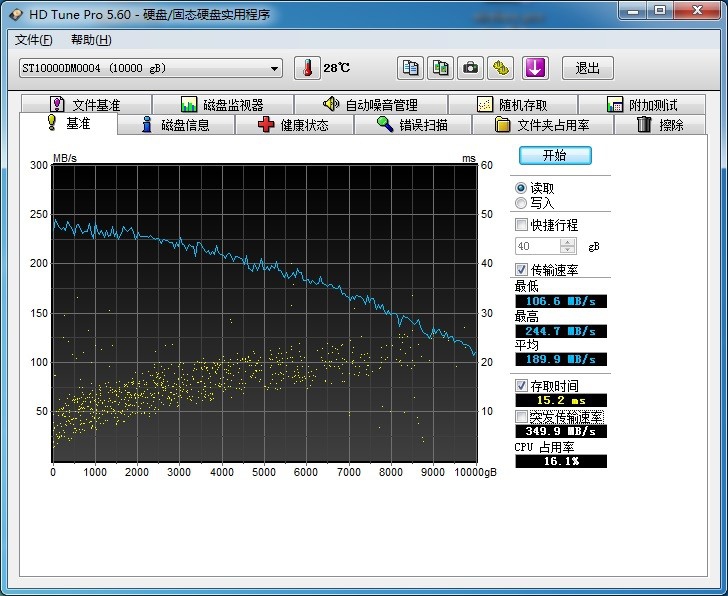 繼續(xù)測(cè)試可以看到,硬盤的最低讀取速度為106.6MB/s,而最高讀取速度為244.7MB/s,平均速度為189.9MB/s,測(cè)試的曲線變化不大,非常平穩(wěn)
