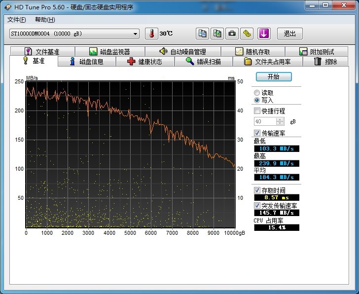 看一下寫入速度,硬盤的最低寫入速度為103.3MB/s,而最高寫入速度為239.9MB/s,平均速度為184.3MB/s
