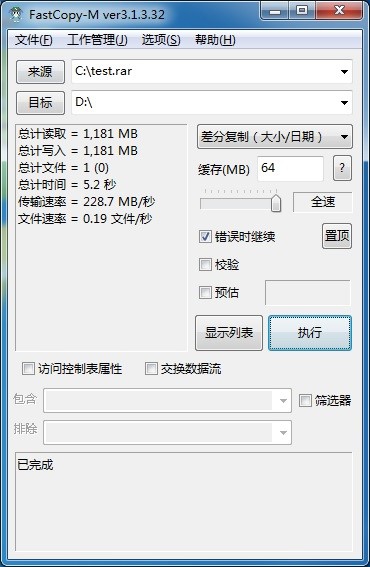 最后我們用FastCopy來模擬真實(shí)讀寫操作,測(cè)試存儲(chǔ)設(shè)備的真實(shí)讀寫速度。