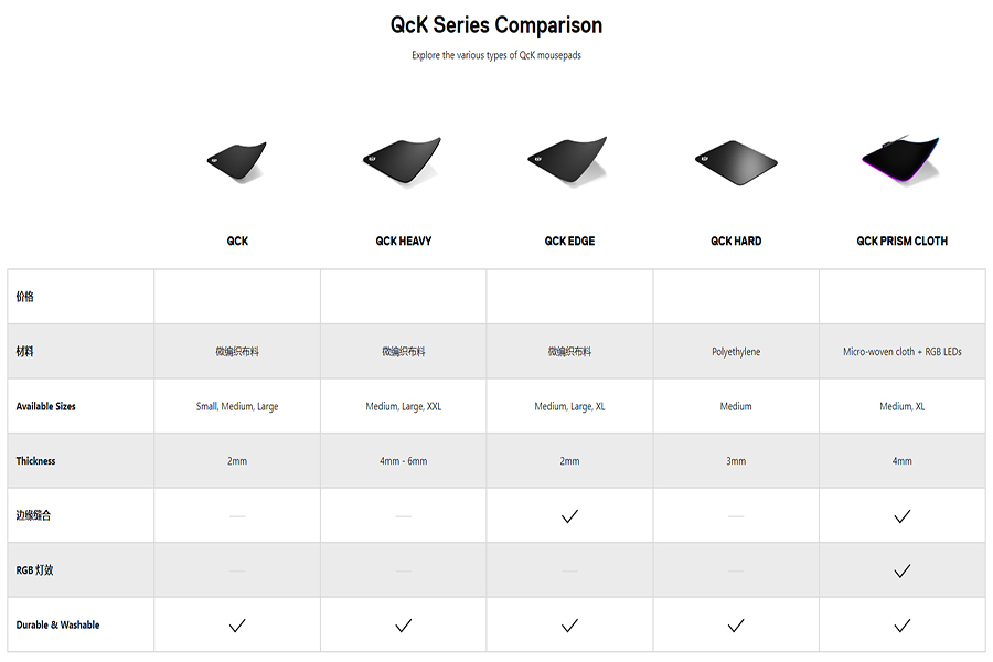 QCK:表面為微編織布材質,底部為橡膠材質,有S、M、L三種尺寸,厚度均為2mm;