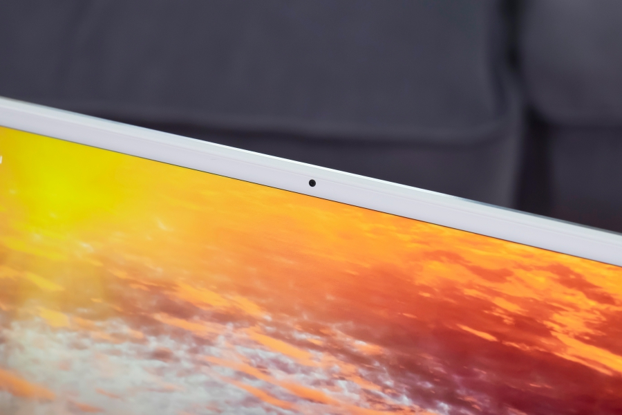 翻開屏幕,首先看到的是攝像頭的位置發生了變化,由原來的屏幕底部移到了頂部居中位置,從而避免了鼻孔視角的尷尬。不過因此XPS 13 9380的額頭相比上代產品要稍微寬些,但好在底部邊框有所收斂。同時,XPS 13 9380的攝像頭也發生了微妙的變化,使用了筆記本界最小的2.25mm全新四元透鏡式攝像頭,但略有遺憾的是人臉識別因此而被取消。