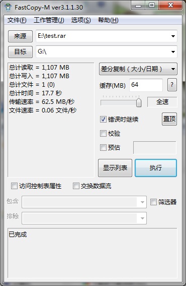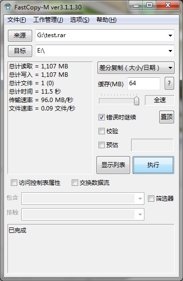 FASTCopy測(cè)試讀取速度為96MB/s,寫入速度為62.5MB/s