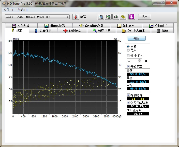 HD Tune測(cè)試平均讀取速度為98.5MB/s