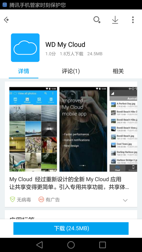看完了外觀以及功能,我們來看一下手機端的應(yīng)用,由于西數(shù)之前對APP進行了升級,使得我們使用起來更加的方便和簡單了。首先我們需要下載APP,本文以安卓為例,在主流應(yīng)用市場搜索WD My Cloud APP下載并安裝。